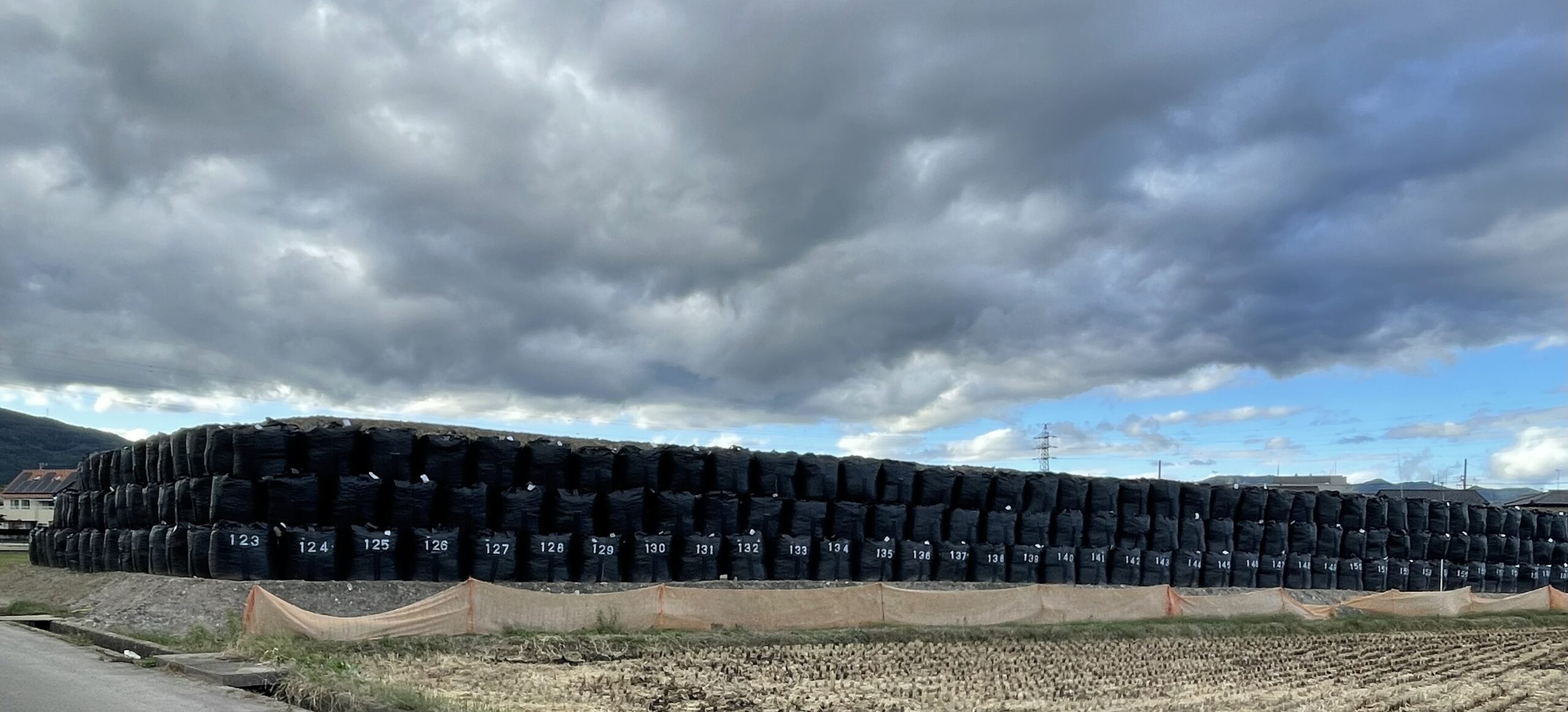 9月の新着に載せた現場はこの通り、土や石が入った大型土のうがびっしり三段に積まれています。道路からの高さは約4mとなります。
